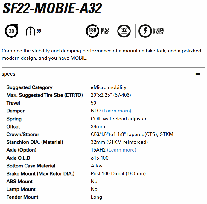 SUSPENSION FORK, MOBIE-A32 NLO DS 15AH2 20" x 2.25", 15mm x OLD 100mm, 20" x 2.15", travel 50mm, tapered steerer